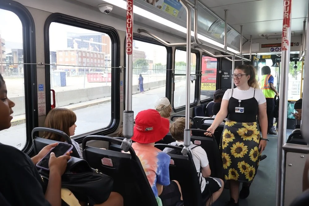 On day one of Bus Camp, campers receive their bus passes for the week, and learn how to scan those passes. Kayla from IndyGo, left, talks to the bus campers about how the system works.